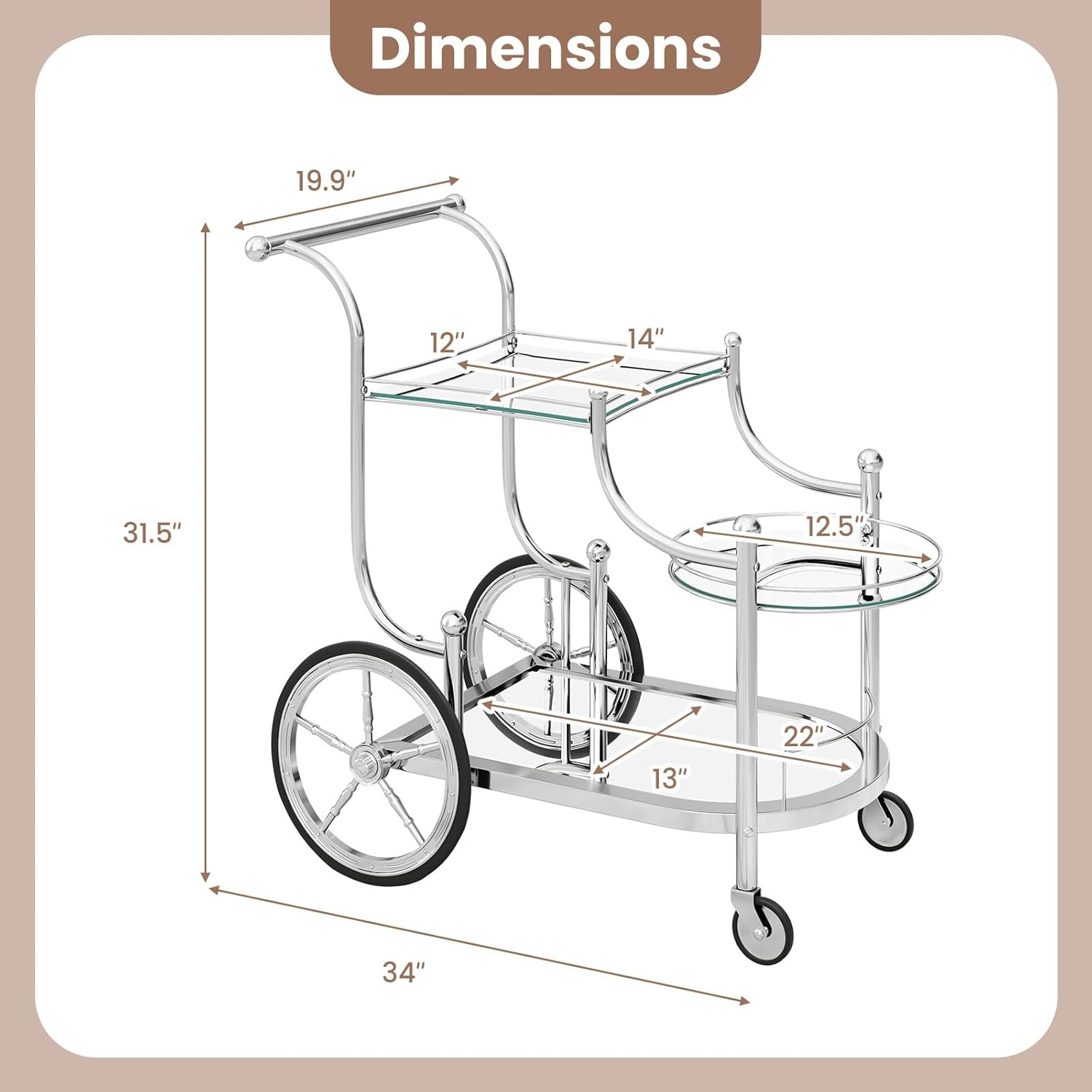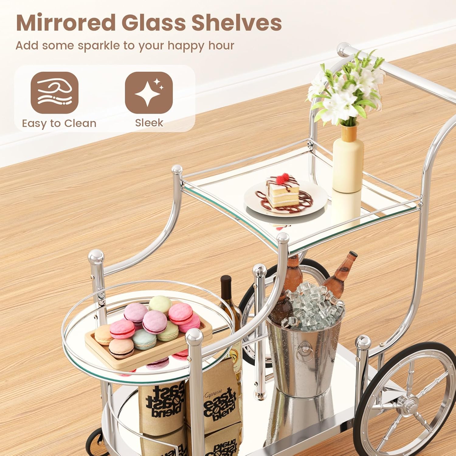 ReunionG Silver Bar Cart with Wheels, 3-Tier Rolling Serving Cart w/3 Mirrored Shelves, Mobile Tea Drink Beverage Wine Trolley Home Bar Kitchen, Dining Room, Living Room, Hotel, Club (Silver)